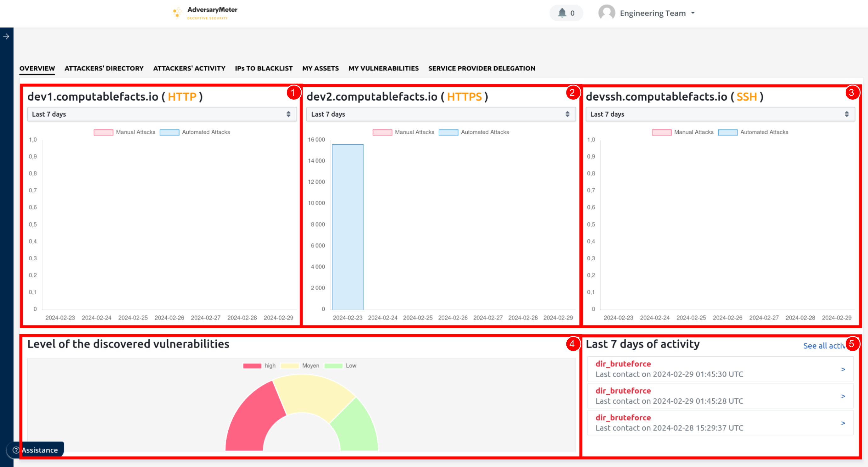 Offre une vision synthétique du nombre d'attaques automatisées et manuelles ayant eu lieu sur le honeypot HTTP sur une période de temps donnée : 7 jours, 14 jours ou 30 jours glissant.