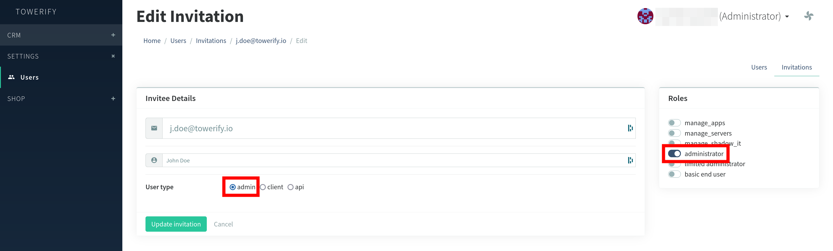 Pour créer un compte de type Administrateur, cliquez sur l'onglet invitations puis sur le bouton invite new user. Saisissez alors l'email de l'utilisateur, sélectionnez admin comme type d'utilisateur puis associez le compte au rôle administrator :
