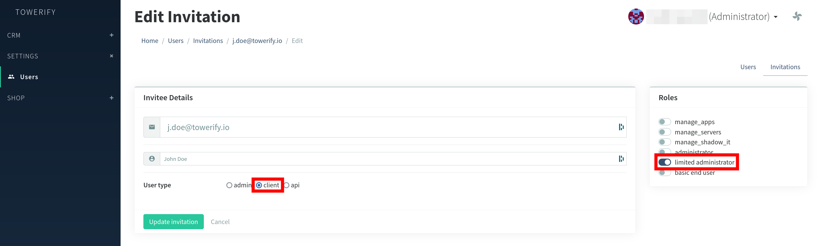 Pour créer un compte de type Administrateur Restreint, cliquez sur l'onglet invitations puis sur le bouton invite new user. Saisissez alors l'email de l'utilisateur, sélectionnez client comme type d'utilisateur puis associez le compte au rôle limited administrator :